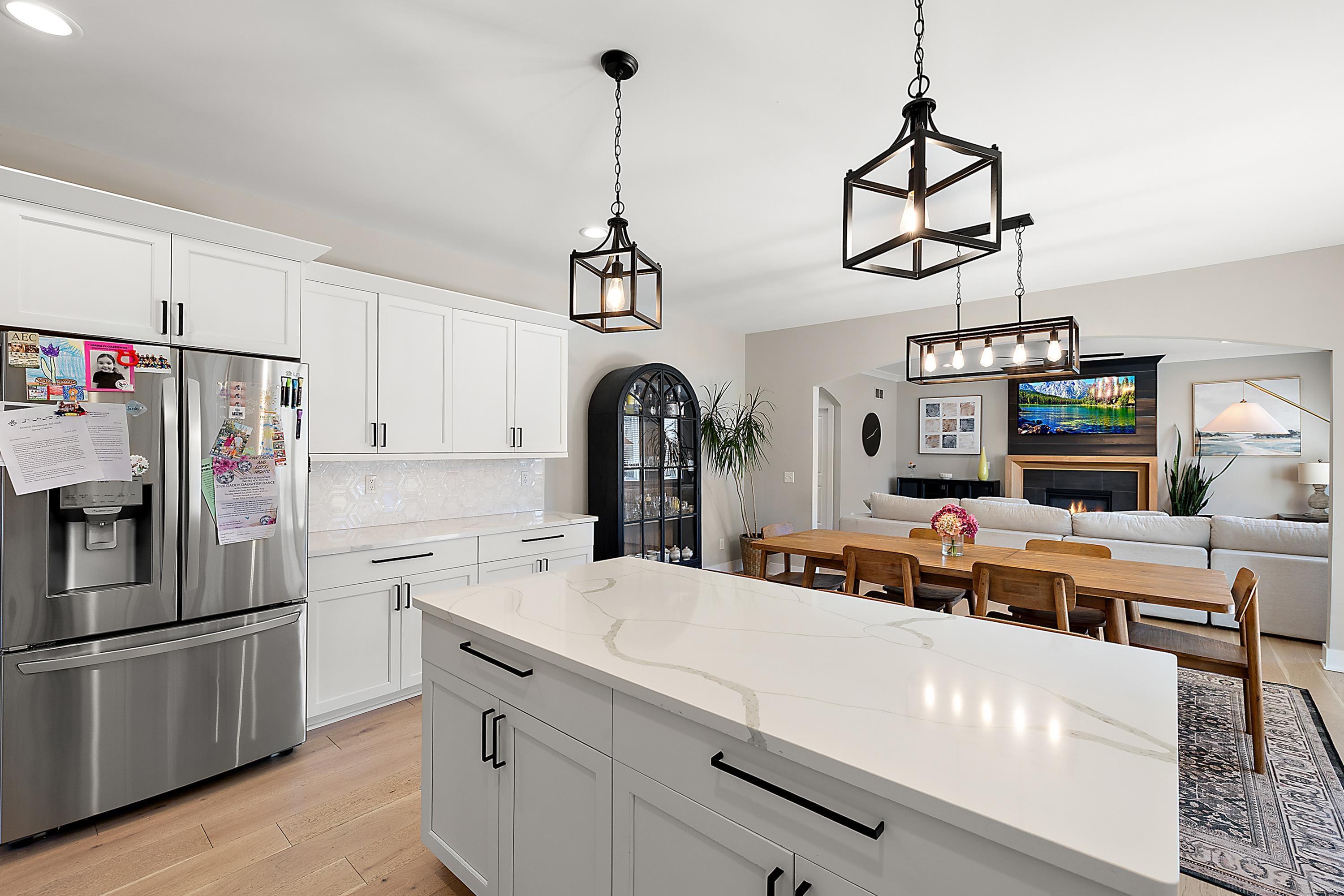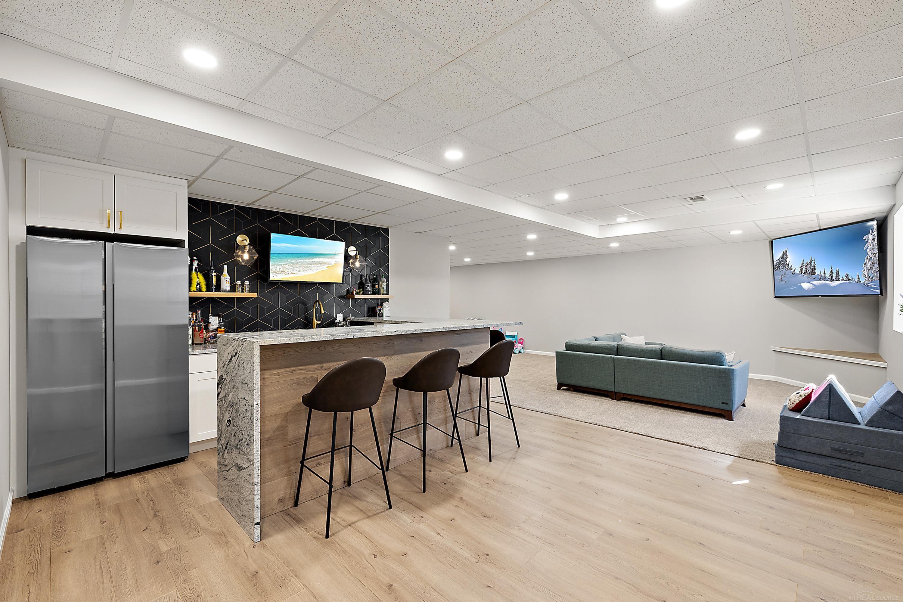 Welcome to this stunning 2022-built Colonial located in the heart of Shelby Township within the highly sought-after Utica Community Schools district. Situated on just under a half acre private parcel surrounded by mature trees, this property offers a peaceful backyard setting with a fully fenced yard, no HOA, and no subdivision restrictions. The home features a striking brick and stone elevation complemented by oversized black exterior / white interior maintenance-free vinyl windows. A rare 4-car side-turned garage and 20’ x 12’ covered rear loggia create the perfect setting for outdoor entertaining. Inside, the thoughtfully designed open-concept floor plan is ideal for modern living. The entertainer’s kitchen boasts custom LaFata cabinetry, stainless steel appliances, quartz countertops, and a spacious walk-in pantry, flowing seamlessly into the expansive great room highlighted by a natural gas fireplace with tile surround and decorative trim extending to the ceiling. Engineered wood flooring runs throughout the entire first floor with tile in the mudroom entry. This home offers 4 bedrooms, 4.5 baths, and a dedicated den/office with decorative trim accent wall, combining luxury with everyday functionality. The mudroom features a custom built-in bench and drop zone, while the staircase showcases wrought iron spindles. Additional conveniences include direct basement access from the garage. The spacious primary suite features a beautifully finished bath with high-end tile work and a freestanding soaking tub. The fully finished basement adds incredible additional living space, complete with a 4th full bath, private office, impressive bar with full tile backsplash, exotic countertops and modern waterfall edge, plus a large open entertainment area. Move right in and enjoy newer construction without the wait—along with the privacy and flexibility of owning a parcel with no HOA restrictions.